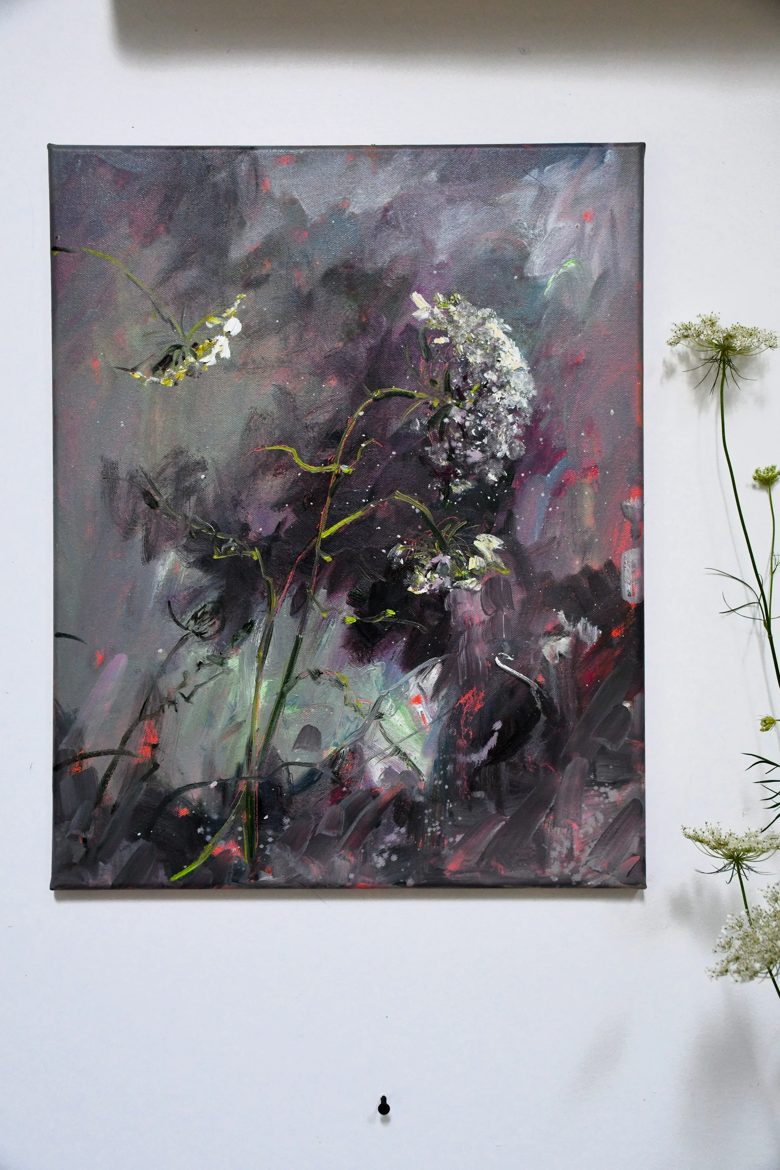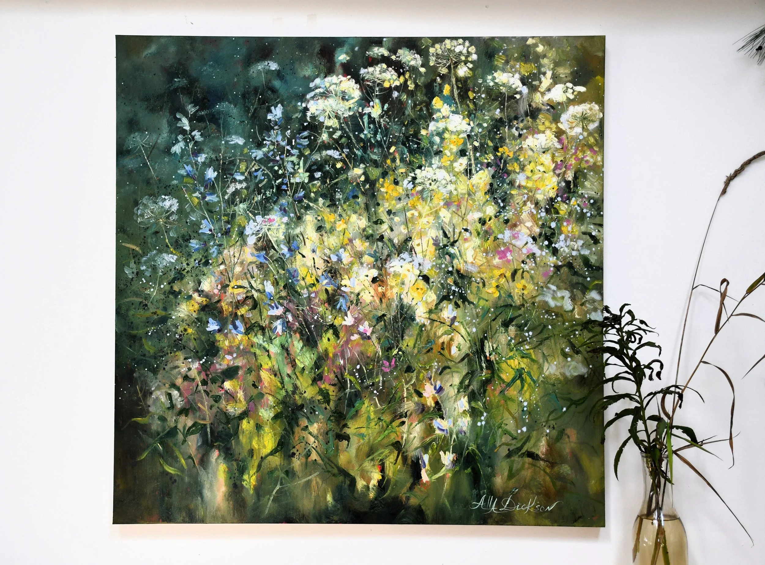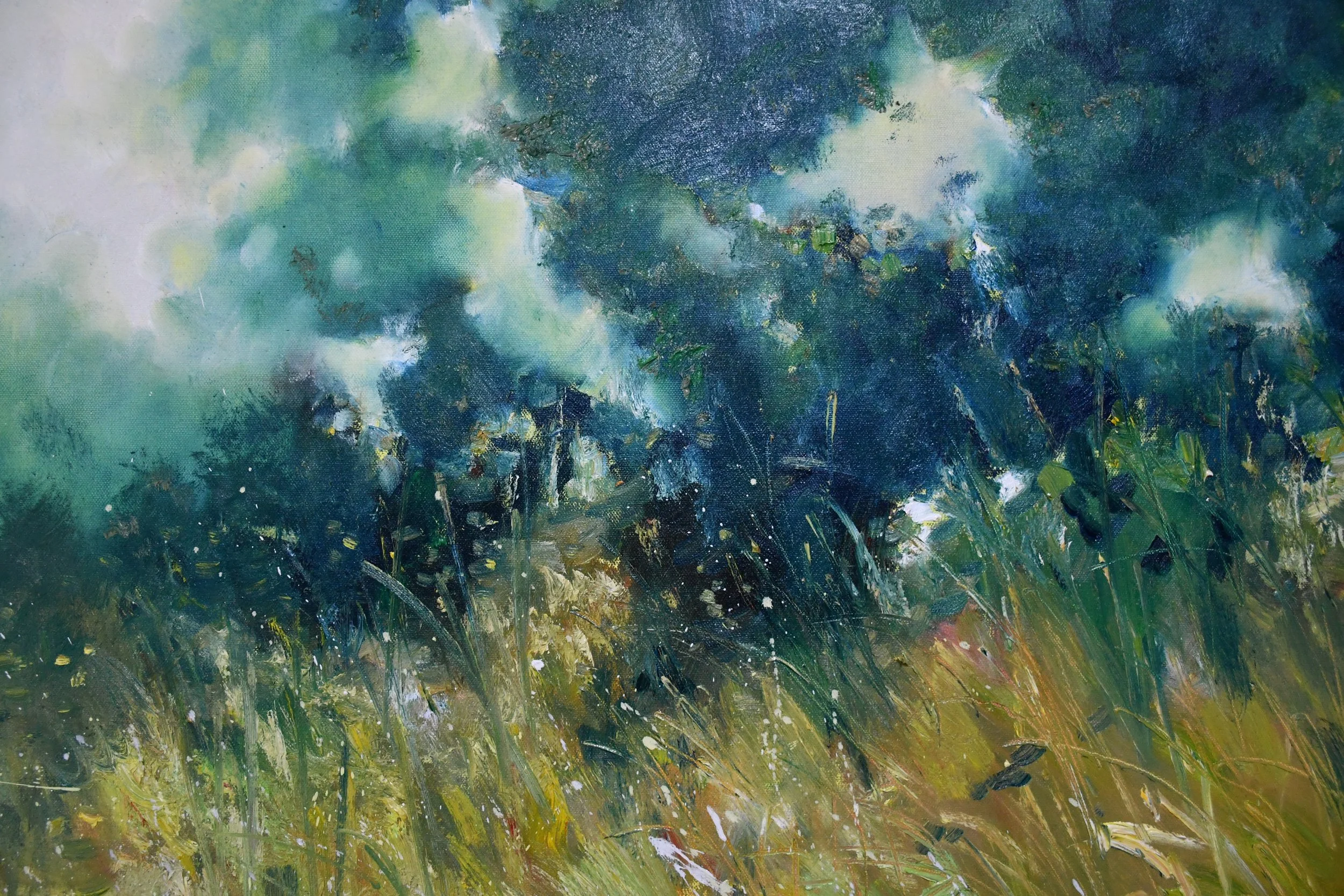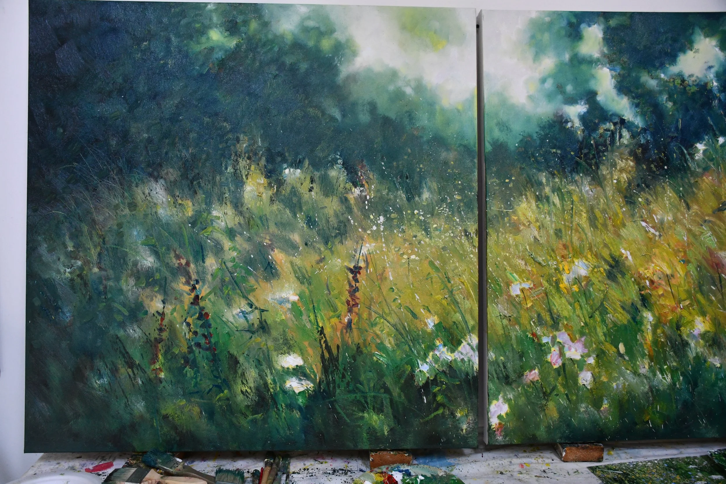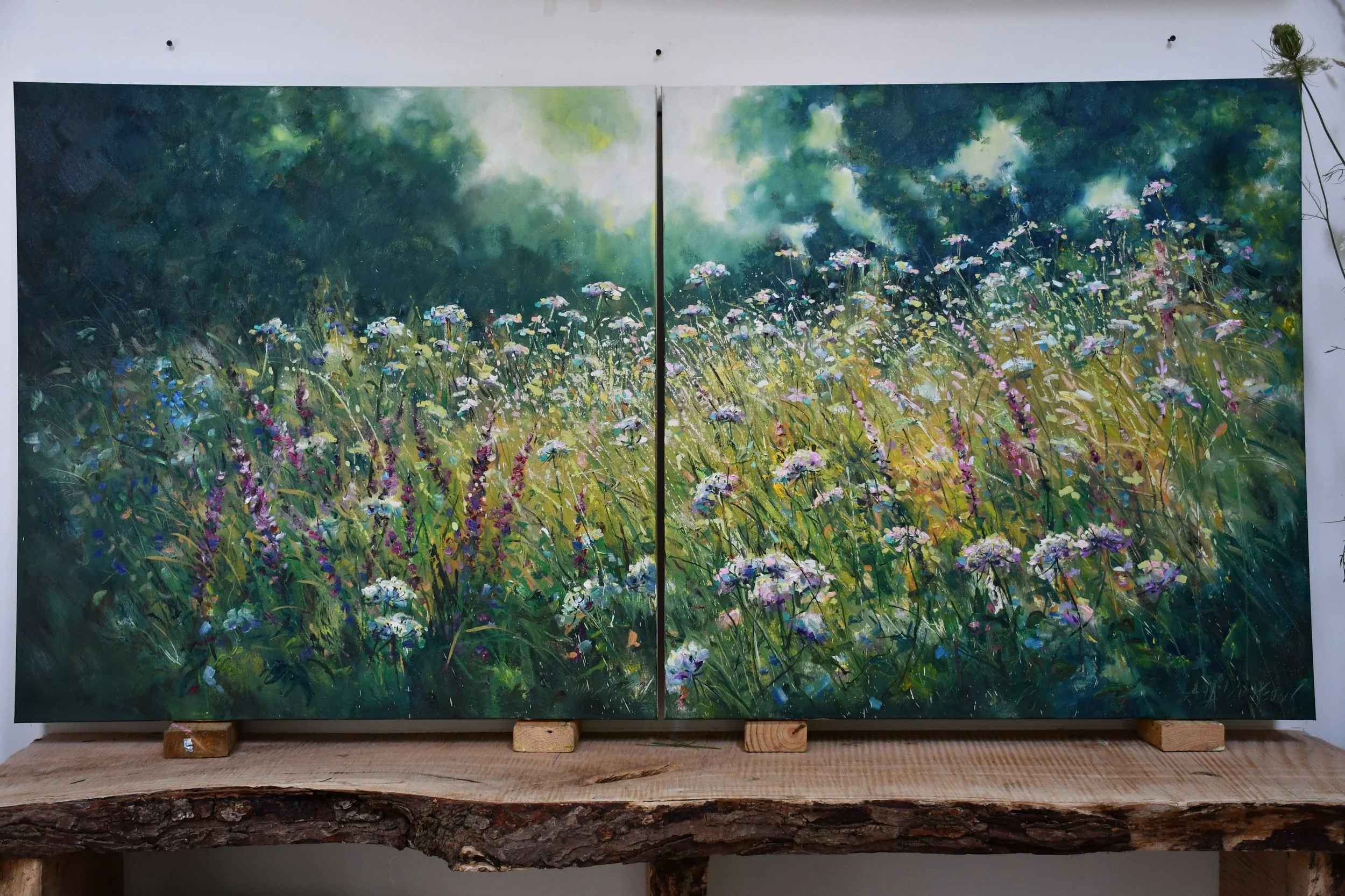 My distinctive painting style is characterized by loose and expressive brush strokes (and at times, the palette knife), varying in density, thereby bestowing a three-dimensional essence to the artwork. As the room's illumination shifts throughout the day, so does the play of light in the painting, breathing life into it.