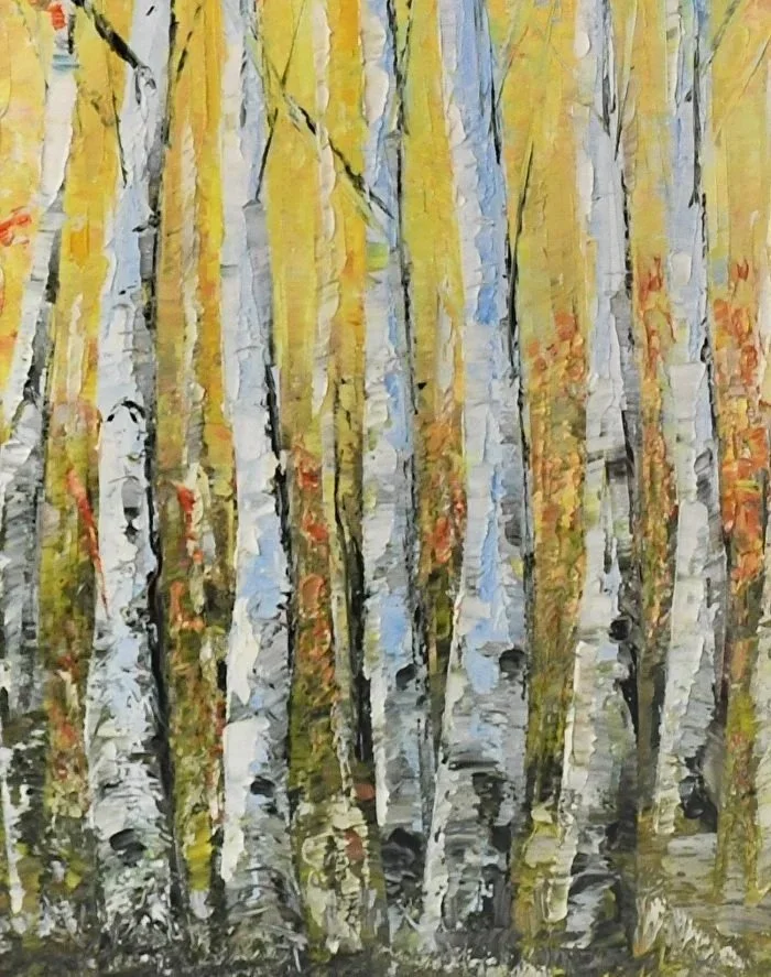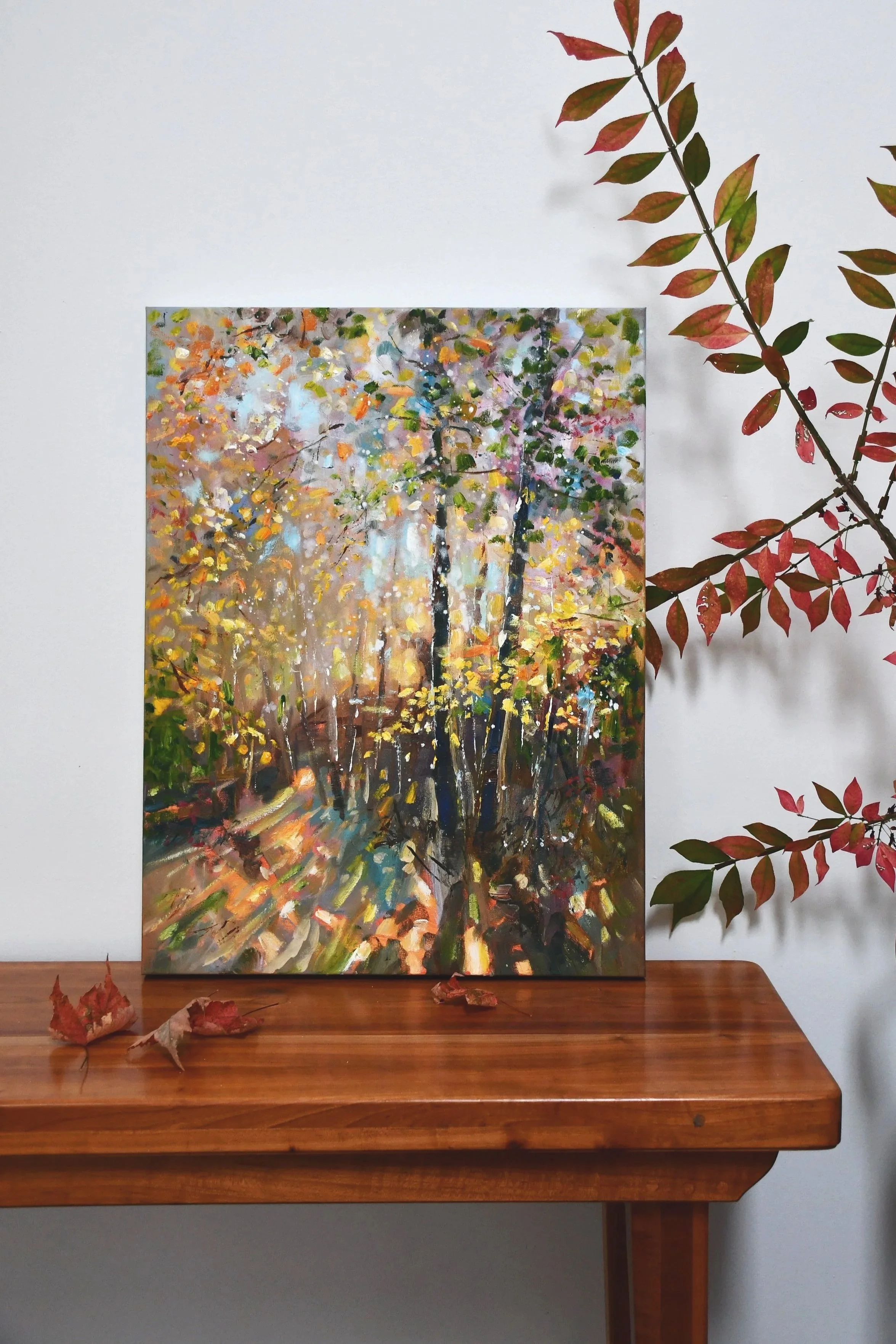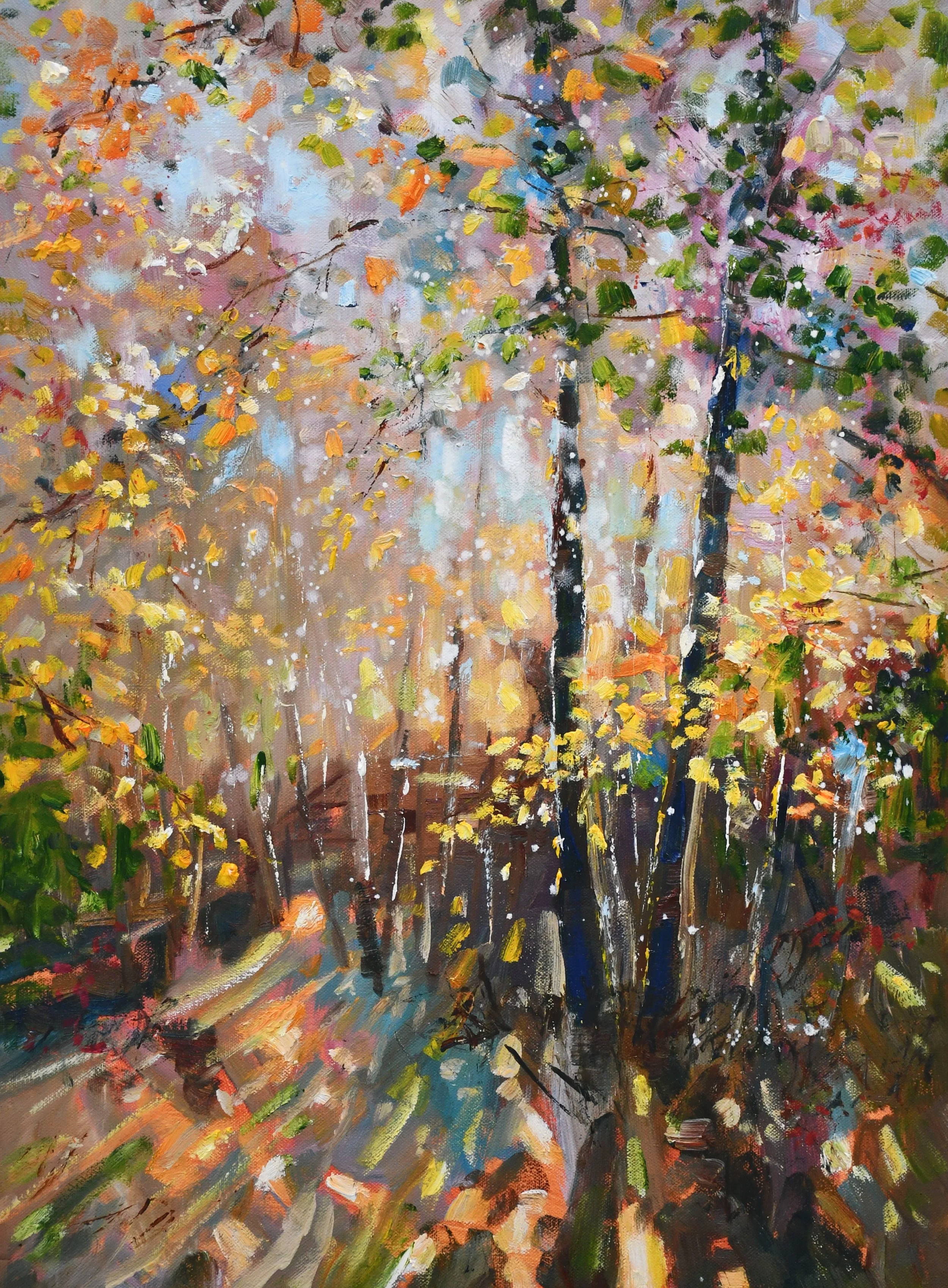 “Her Majesty Light”, an oil on canvas painting, is all about light, the effect that light has on us- the hope, the hopefulness, the joy, the place of safety. This impressionistic oil landscape expressively depicts deep beauty and spirituality of trees. Rich texture of the palette knife’s bold strokes add energy and vibrancy. This painting will be perfect center of any home, whether it is modern, traditional or cottage.