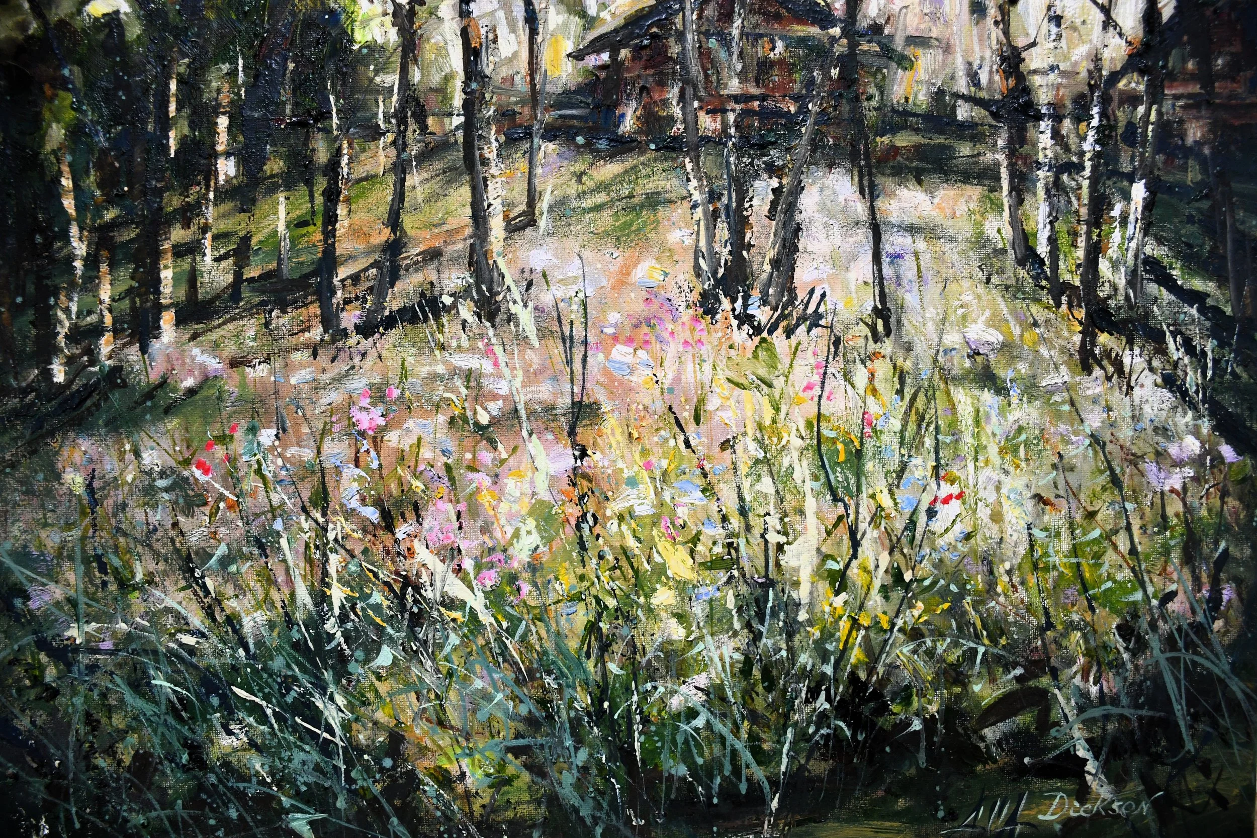 "Sunrise Fog over the Forest Meadow" is a summer wildflower impressionistic oil painting. It is reported to me from hundreds of my art buyers that each painting has immense positive energy and brings HEALING. This piece of art has been painted as a demonstration in the studio during Artists’ Retreat after an early morning mediative time at this meadow by the woodland.